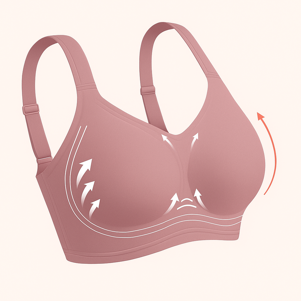 Our Wireless Comfort Bra is designed without underwires, meaning no digging, pinching, or pressure. It molds to your shape while giving you natural lift and full-day comfort — all without sacrificing support.